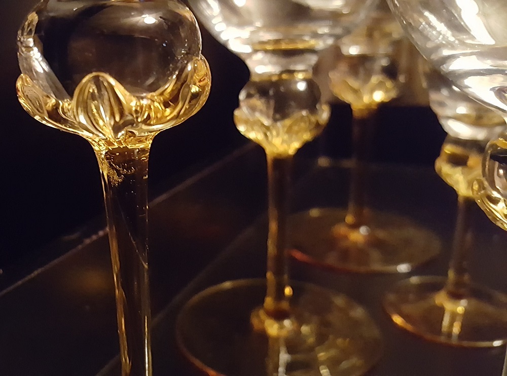 Setting for 8 people PLUS. This is one of the most exquisite crystal stemware services you will ever see. The pictures really don’t capture their elegance. They are believed to be hand-blown with a beautiful leaf or petal design in the center with a sphere perched on top. They start at the base with a deep golden honey orange color and progressively get lighter and clearer, transitioning through vivid golden honey yellow right up to crystal clear! You can feel an extreme difference in quality when you pick them up. Each place setting consists of a five-piece service per person. There are a total of eight place settings available, as well as some odd extras. This is an extremely high-end service. $50.00 per 5 piece setting